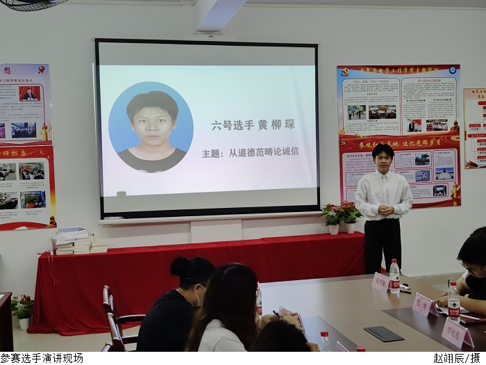陈强在致辞中指出,诚信是中华民族的传统美德,全体学生要以诚为本,以信为根,在学习和生活中坚守诚信,构筑诚信长城,让诚信文明之花绽放美丽校园。她希望进入决赛的六名选手能用精彩的演讲展示电院学子拼搏向上的青春风采,将诚信作为生活准则,时刻牢记记在心中,诚实做人,诚信做事,争做“电院诚信领路人”。