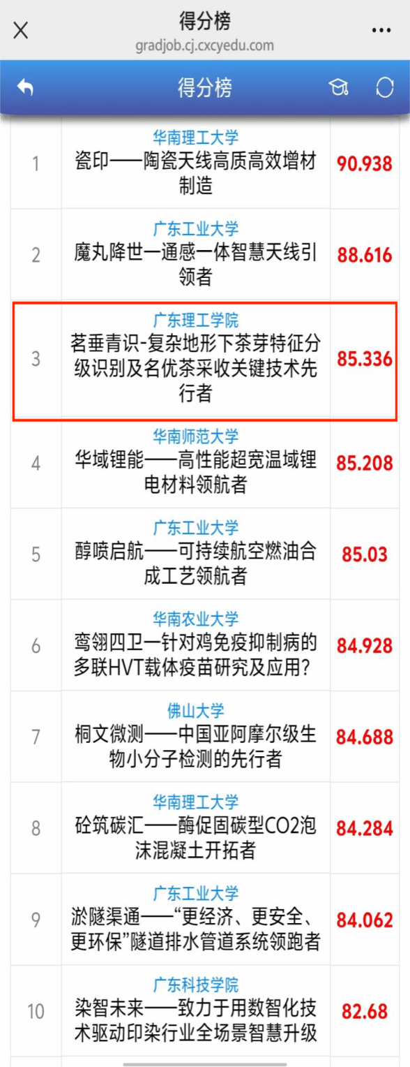 历经多年蓄力,我校终于再度跻身省级决赛舞台。在中国国际大学生创新大赛广东省分赛决赛现场,由李浩源、曾宇奇、何柏宇、余夏萌等同学组成的“茗垂青识”团队面对分组中来自华南理工大学、华南农业大学、华南师范大学、广东工业大学等高校的数十支强劲队伍,顶住压力、沉着应战,在上半场答辩环节结束后一度跃居小组第三,展现出广理学子优秀的创新素养和临场发挥能力。