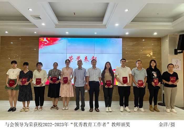 活动现场,宣读了叶运黎、金洋、王天凤、黄美莲、李彬、胡林林、李欣雪、吴琼、覃凤、周莹、康泽威教师荣获校2022-2023年“优秀教育工作者”荣誉称号,与会领导为他们颁奖。胡林林代表优秀教育工作者发言,向大家分享了她的教育理念与心得体会。