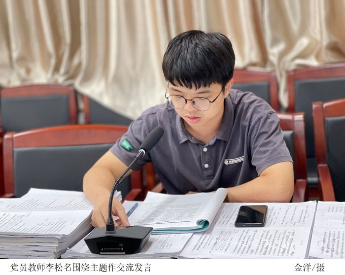 李松名,吴琼两位党员教师围绕主题进行发言。他们表示,作为一名年轻教师,通过此次主题教育使他们看待问题的格局得到了提升。学之愈深,知之愈明,行之愈笃,他们将不断深入学习领悟习近平总书记的重要讲话,提高自己的思想水平,为学院乃至学校的提质培优工作贡献自己的力量!