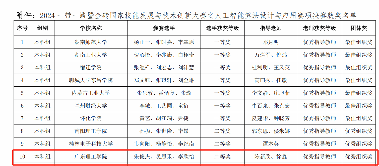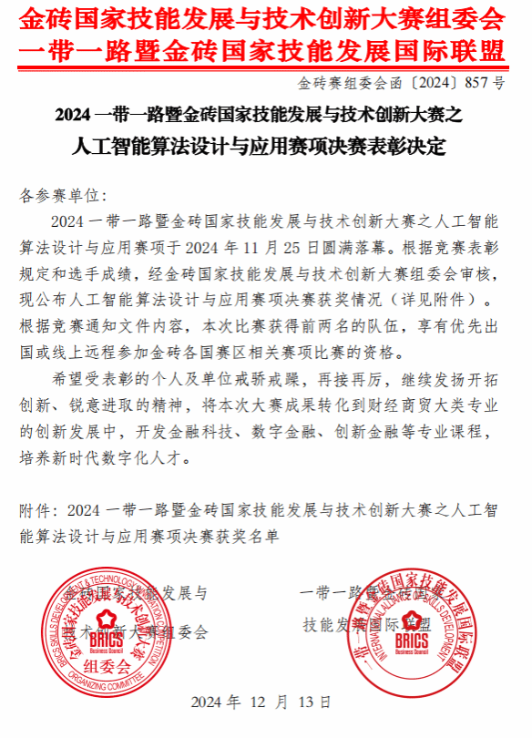 本网讯(太阳网集团tcy8722融媒体中心 舒佳宇)近日,太阳集团tcy8722人工智能产业学院接获文件通知后,迅速行动,积极筹备并精心组织1个项目参与2024年第八届一带一路暨金砖国家技能发展与技术创新大赛人工智能算法设计与应用赛道。该项目团队由太阳网集团tcy8722副院长陈新欣与科大讯飞人工智能产业学院老师徐鑫指导,朱俊杰、吴恩禾、李欣怡三位同学组队参赛。在学校和企业导师的协同指导下,项目斩获国家二等奖,项目指导老师荣获优秀指导老师称号,学校荣获优秀组织奖。
