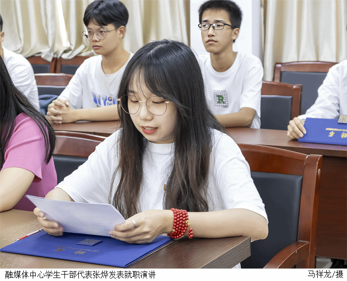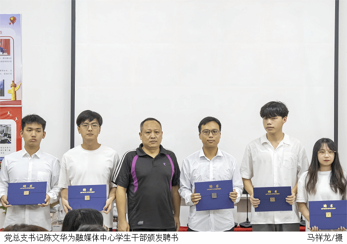 陈文华为融媒体中心学生干部颁发了聘书。融媒体中心学生干部代表张烨发表就职演讲,就如何带领好融媒体中心团队、做好后续各项工作进行汇报。