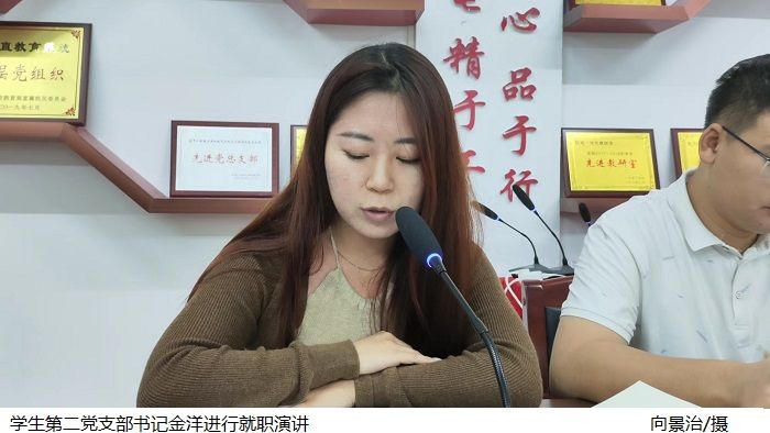 金洋发表了就职演讲,她表示会与学生党建工作中心的干事们共同努力、携手并进,为同学们继续提供丰富多彩的党建活动。