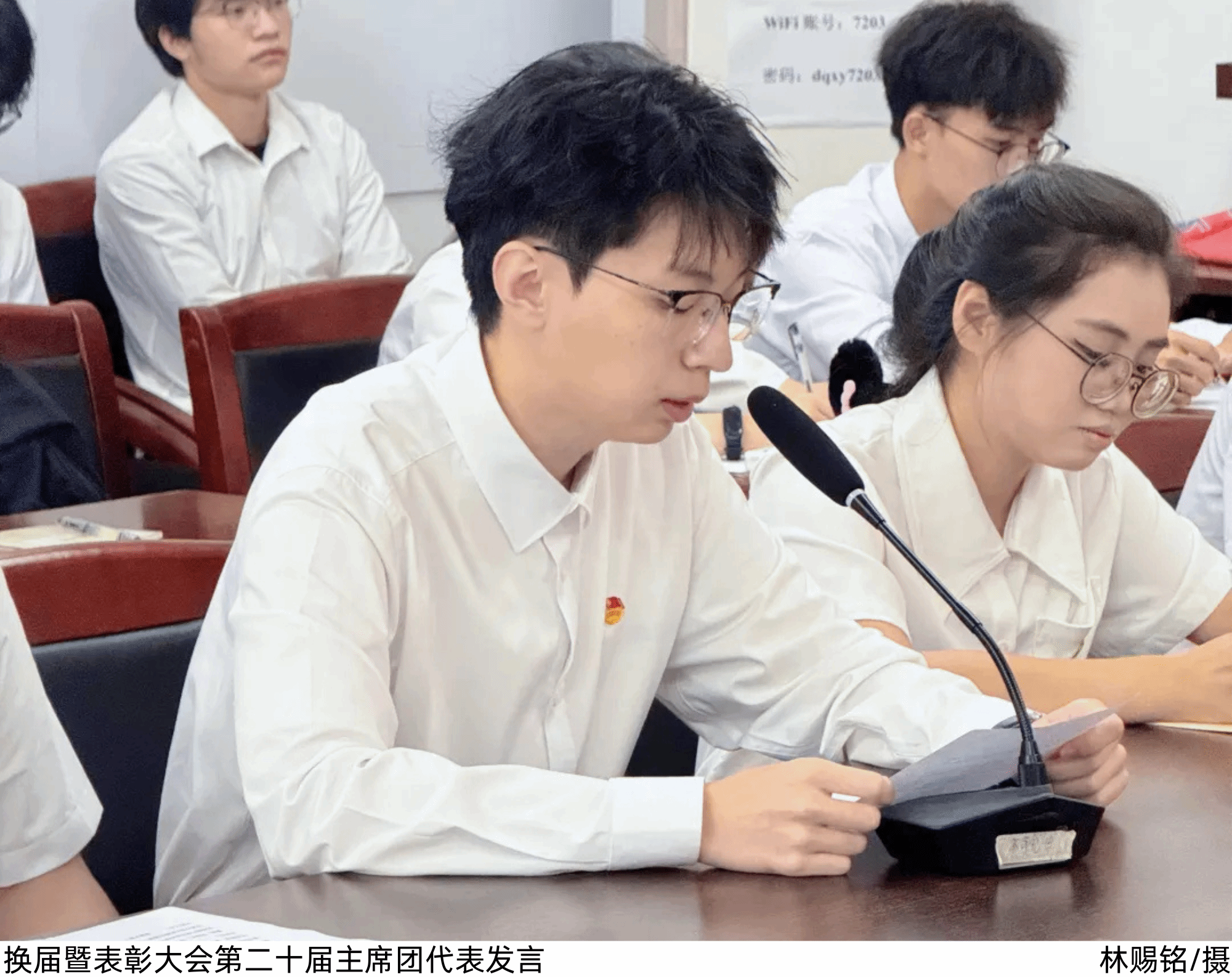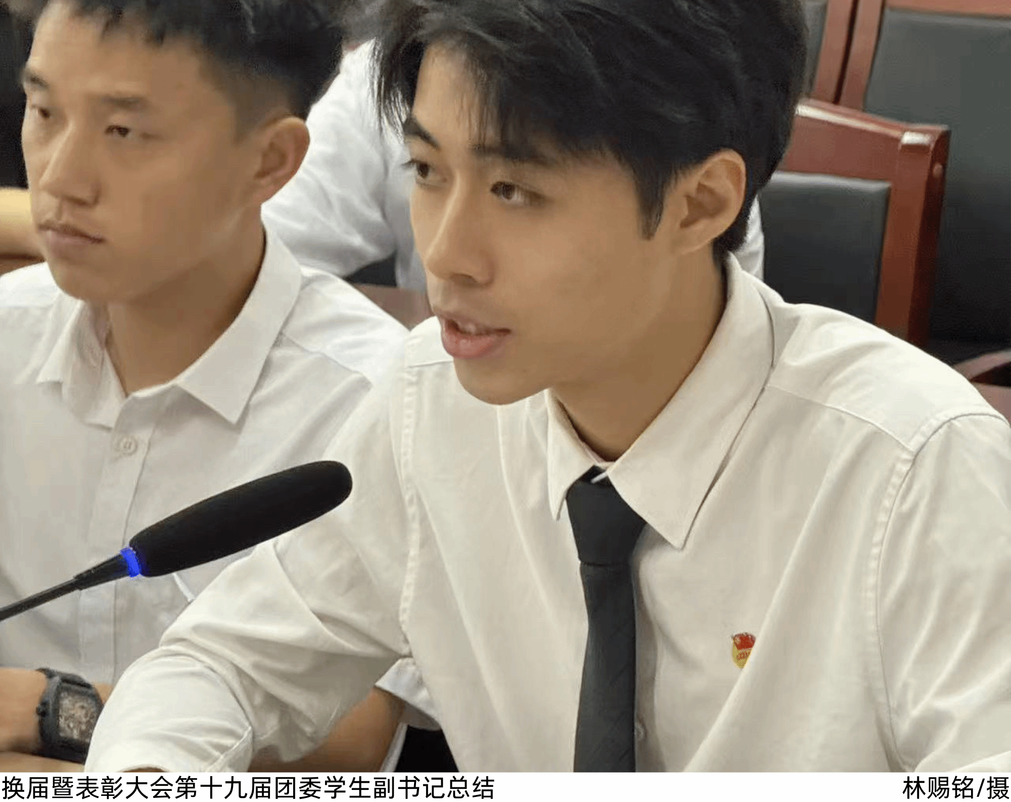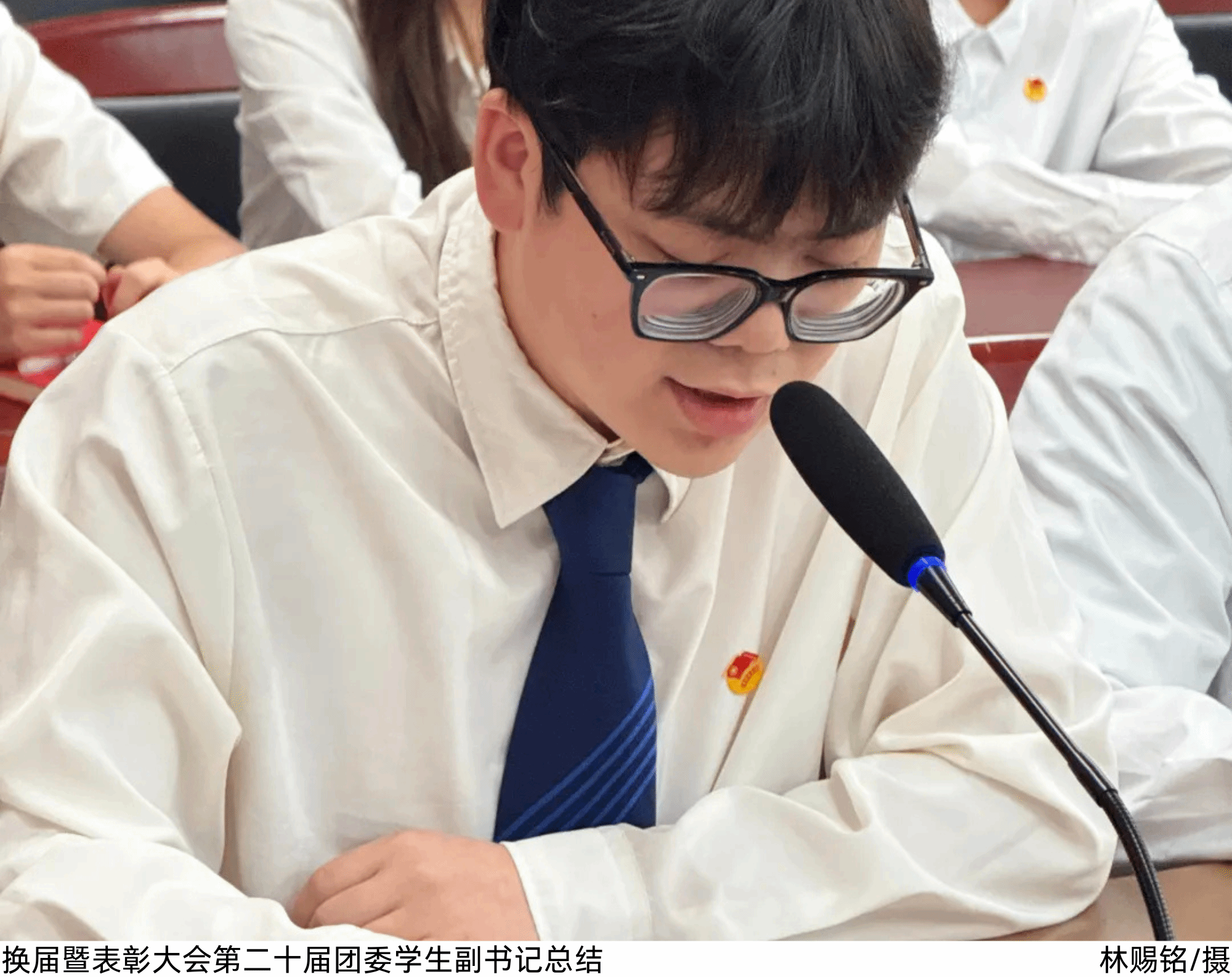 第二十届团委学生副书记曾宇奇在发言中从三方面阐述并回顾工作经历与收获:一、思想上配合学院开展主题教育,筑牢同学价值观;二、行动上搭建沟通桥梁,丰富校园活动;三、团队建设上打造高效队伍,提升成员素养。他期待与全体成员携手,共创团委、学生会新辉煌。