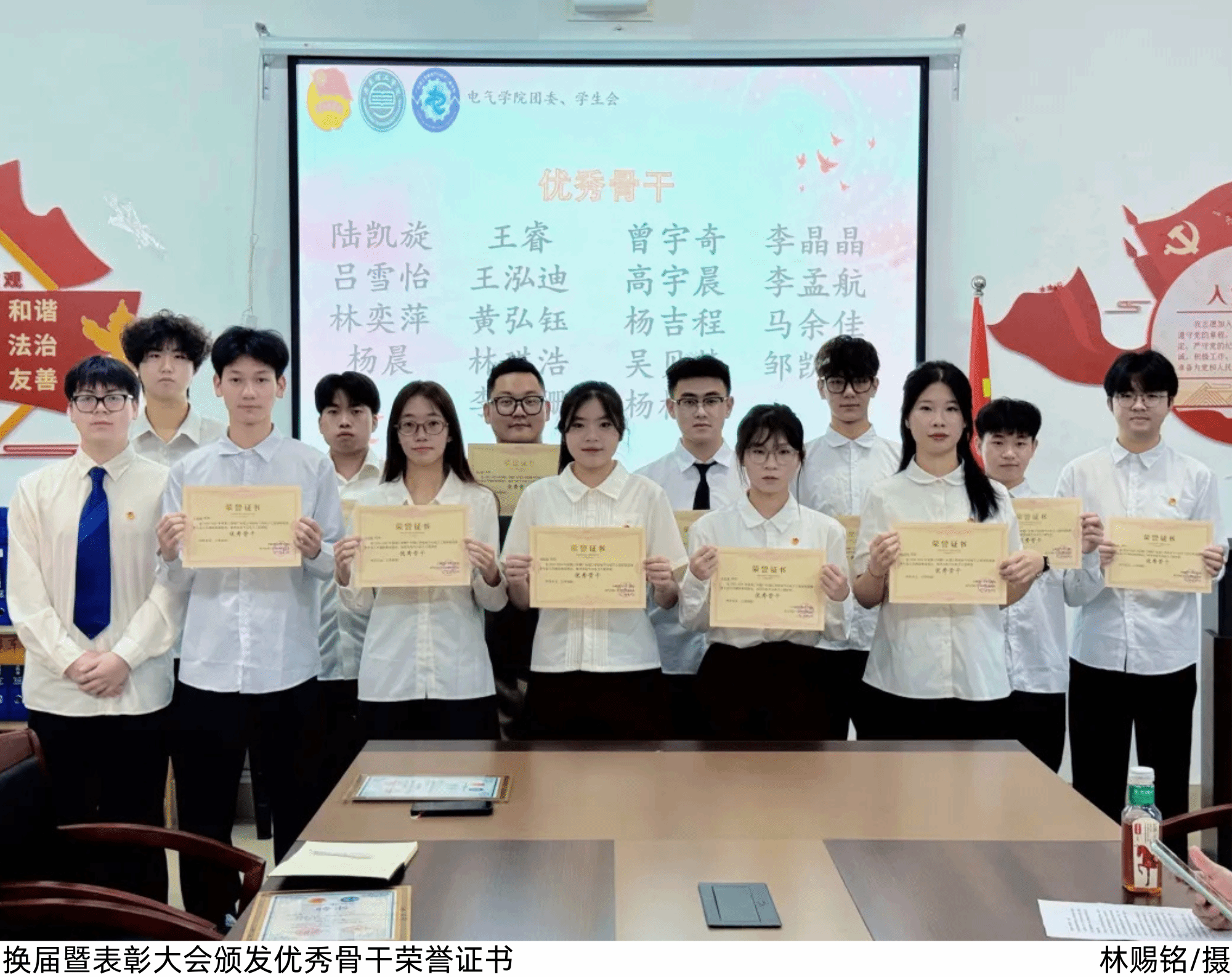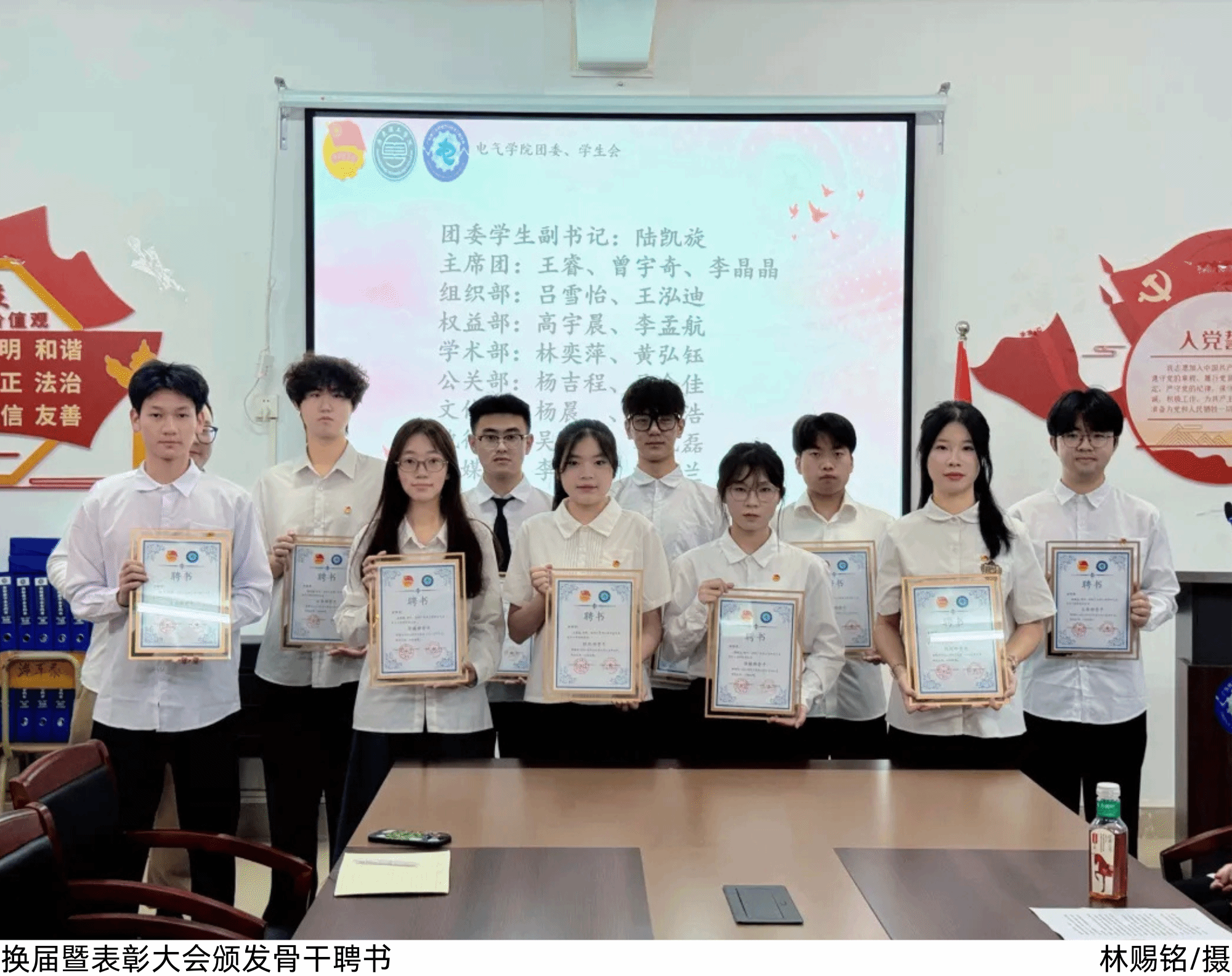 本网讯(太阳网集团tcy8722 叶家宜、李豪、赵凌云)2025年6月19日12时,2024-2025年度太阳网集团tcy8722(以下简称电气学院)团委、学生会换届表彰大会于7栋203室正式召开。电气学院团委书记叶家宜、第十九届与第二十届主席团及骨干出席了本次活动。