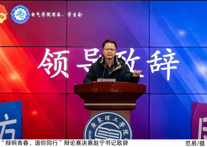 赵宁书记致辞时,向闯入决赛的两支队伍致贺,向工作人员、评委及观众致谢。他表示,辩论是思想交锋与语言艺术的融合,能锤炼思辨能力、提升表达素养,更能培养协作精神与责任担当。他充分肯定了全体参赛学生在赛事中的优秀表现,寄语所有同学要将辩论中的思辨精神融入日常学习与生活。