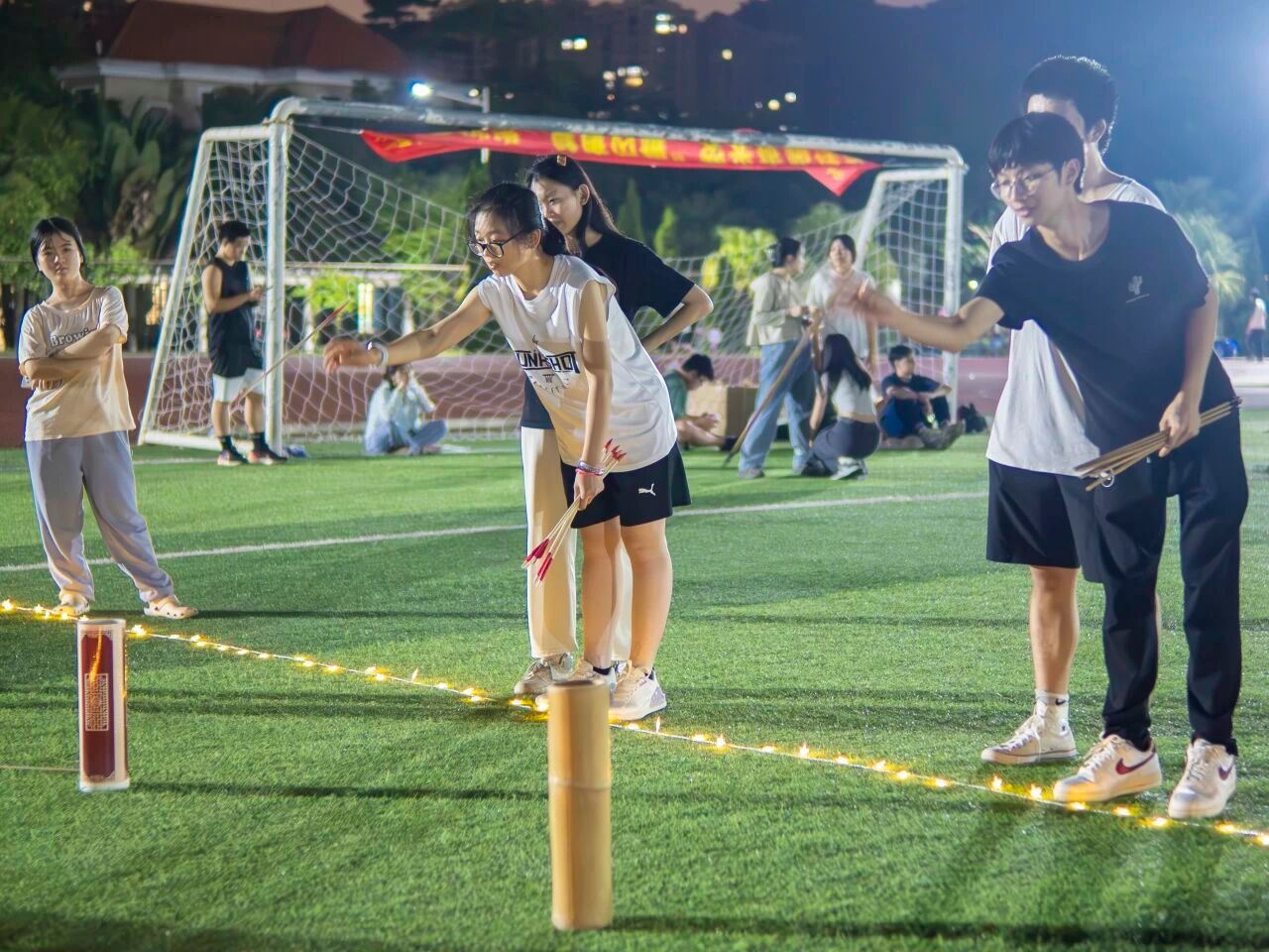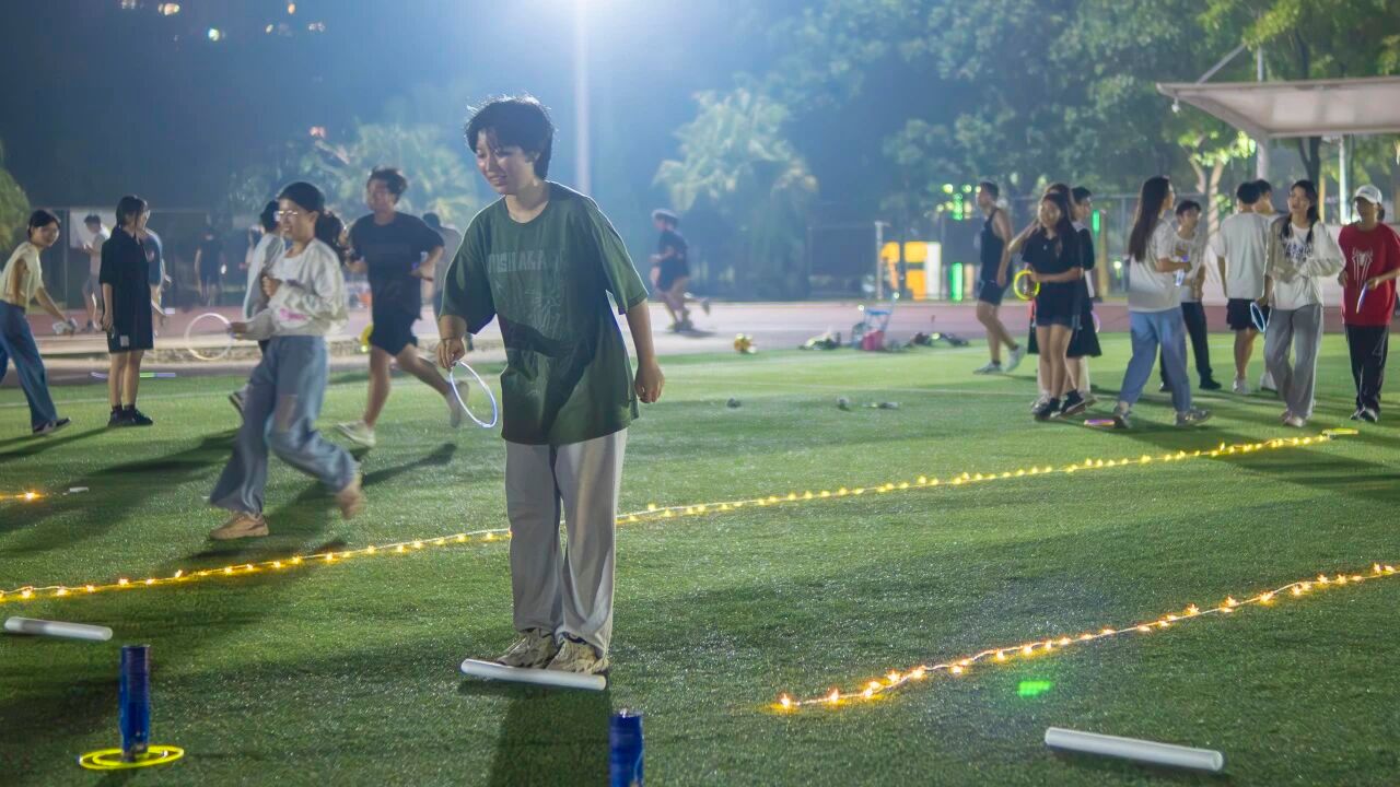 11月10日的趣味夜跑环节将活动推向高潮。光剑投壶考验眼力与耐心,两组选手角逐投中数量;两人三足比赛中,五组选手默契配合、奋力冲刺,展现团队协作的力量;荧光接力套圈圈则以一分钟接力跑+套圈积分的形式,让五组队伍在速度与精准度的较量中收获欢乐。