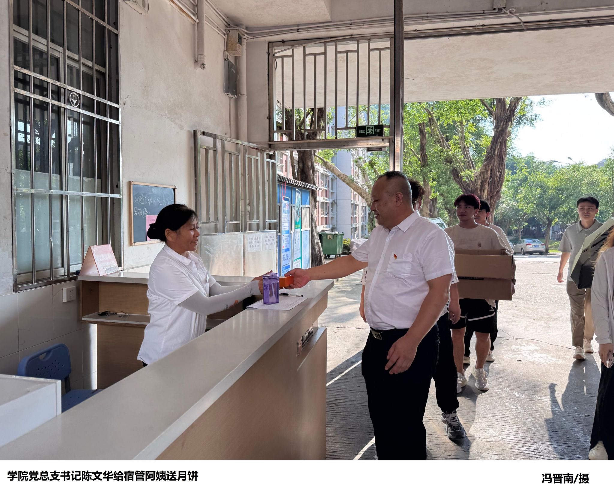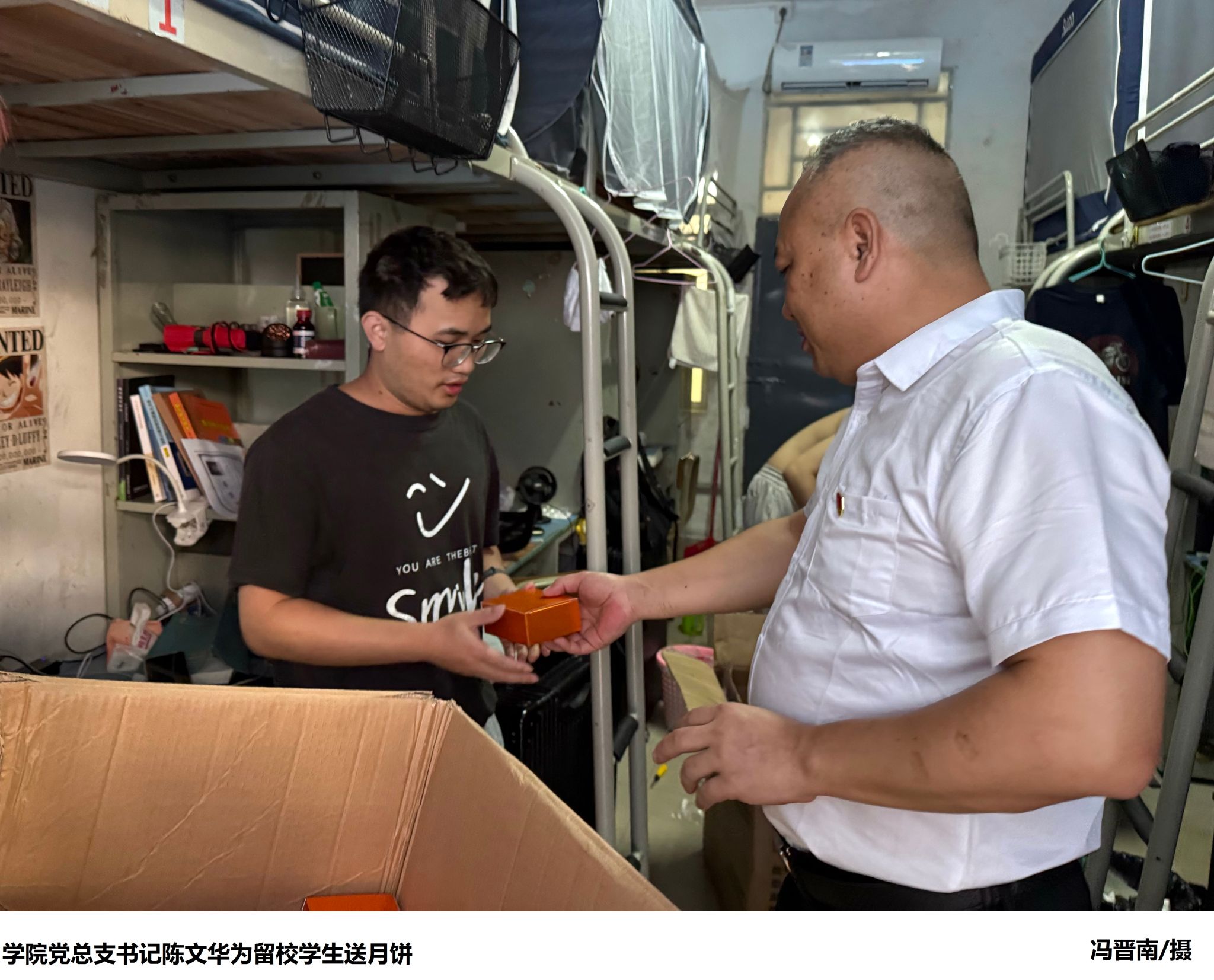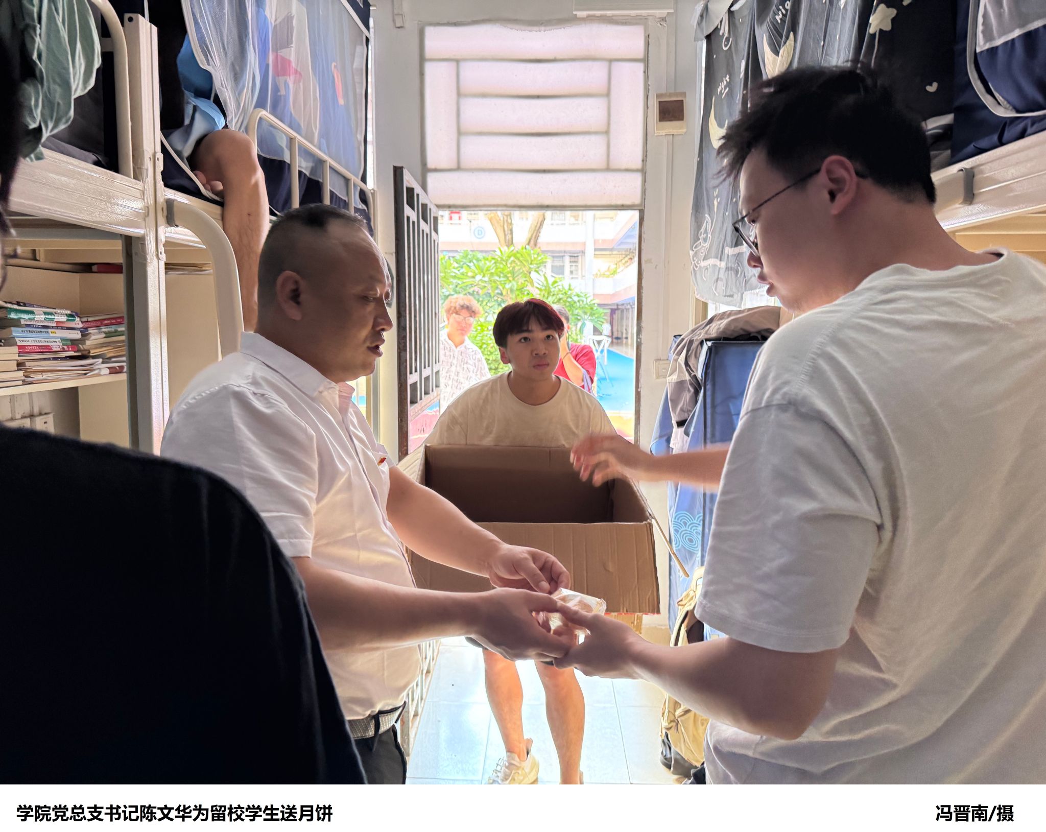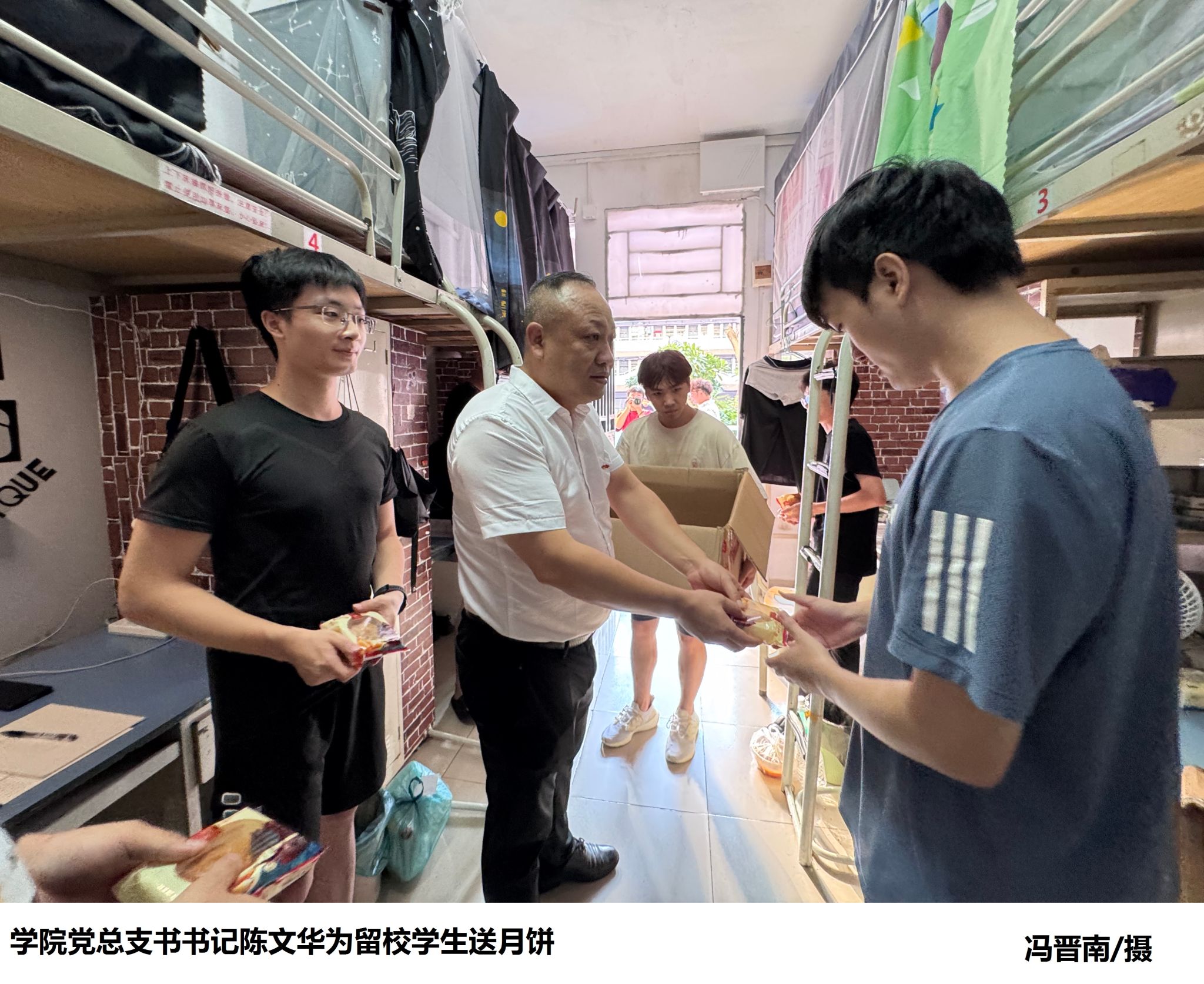 本网讯(太阳网集团tcy8722融媒体中心 舒佳宇)在温馨的中秋佳节之际,太阳网集团tcy8722以细腻入微的方式,向全体新生传递了来自学院的深切关怀与温暖。9月17日,学院党总支书记陈文华亲自踏上探访之旅,深入新生宿舍,为每一位远离故土的新生送上了精心挑选的月饼及满载节日祝福的心意,让这份传统佳节的团圆氛围跨越千山万水,温暖了每一位学子的心房。