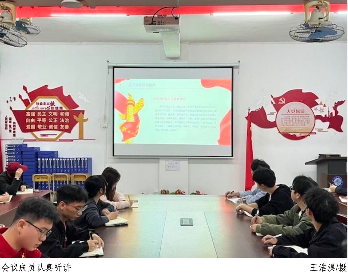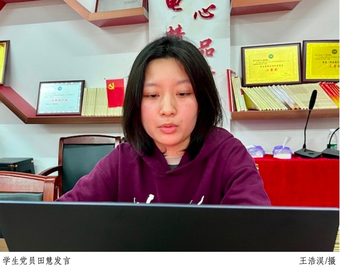 在会上,学生党员田慧解读了习近平总书记在二十届中央纪委四次全会上的重要讲话精神,围绕“全面从严治党”的深刻内涵与实践路径展开阐释,并对新时代“反腐败斗争”的战略部署与成效进行系统分析。她指出,学生党员要深刻把握反腐败斗争规律,坚定不移打好攻坚战、持久战、总体战。田慧还提出三点实践要求:一是强化政治担当,始终把对党忠诚作为首要政治品格;二是筑牢信仰根基,深学细悟习近平新时代中国特色社会主义思想;三是严守纪律底线,将党的二十大精神转化为知敬畏、存戒惧、守底线的行动自觉。