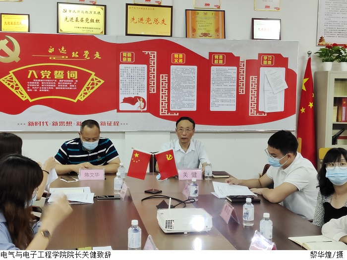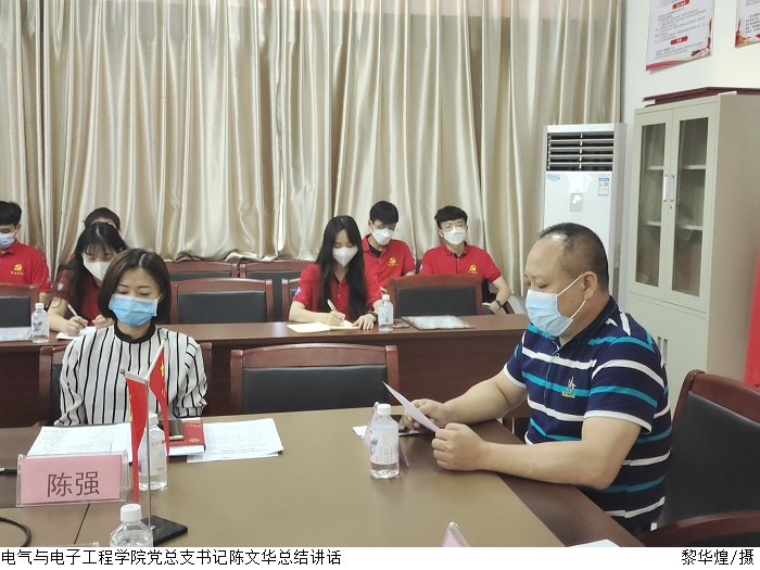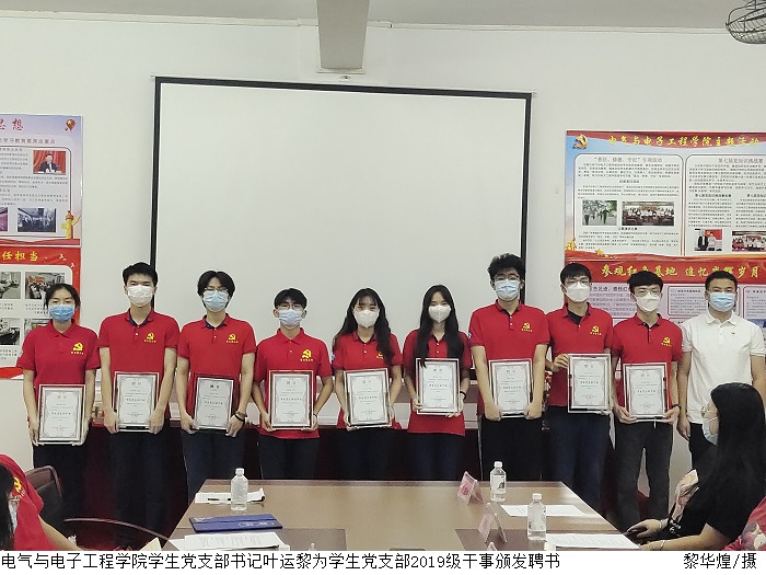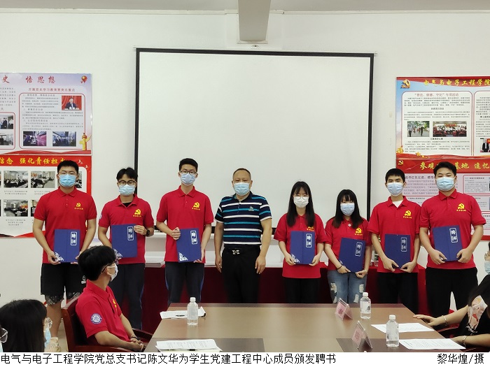 陈强代表党总支宣读了《关于成立学生党建工作中心的通知》、《太阳网集团tcy8722学生党建工作中心部门职责》两个文件,陈文华、陈强、叶运黎为第一届学生党建工作中心学生干部、学生党支部2019级干事颁发了聘书。周厚伟同学代表第一届学生党建工作中心学生干部进行就职表态,陈企宙同学代表学生党支部2019级干事就党建工作进行交流发言。