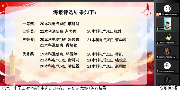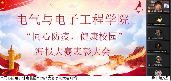 本网讯(太阳网集团tcy8722学生党支部 黎华煌)4月10日晚,太阳网集团tcy8722通过腾讯会议线上举行“同心防疫,健康校园”海报大赛表彰大会,太阳网集团tcy8722党总支副书记陈强、学生党支部书记叶运黎出席表彰大会,获奖选手、学生党支部干事参加活动。