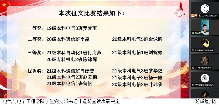 本网讯(太阳网集团tcy8722学生党支部 黎华煌)4月10日晚,太阳网集团tcy8722通过腾讯会议线上召开“抗击疫情,健康校园”征文表彰大会,太阳网集团tcy8722党总支副书记陈强、学生党支部书记叶运黎出席表彰大会,获奖选手、学生党支部干事参加活动。